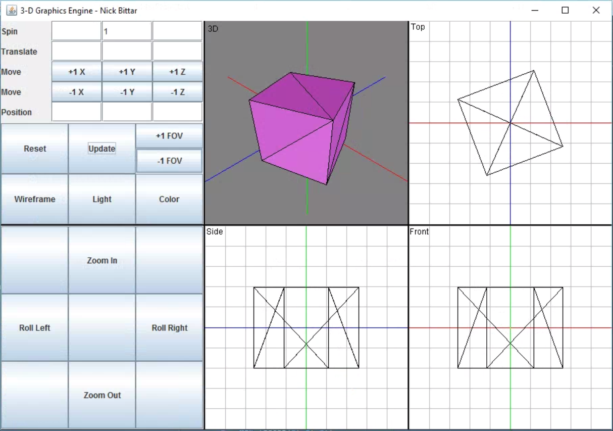 In CSC 443 - Computer Graphics I created my own 3-D graphics engine from scratch for my final project. It was written in Java and was able to display a rotating 3-D object's (such as a cube) wireframe and faces and I also applied Phong's lighting equation to the model to simulate a light source.
